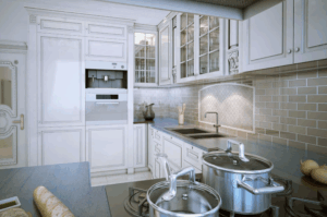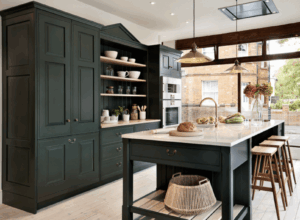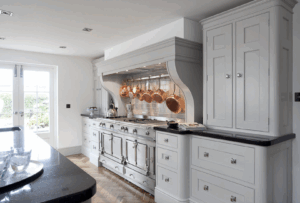 Masywne szafki z klasycznymi frezami, często sięgające sufitu, dodają wnętrzu elegancji i solidności.
