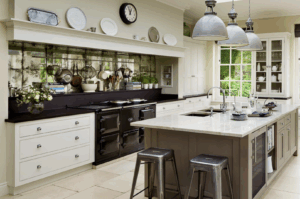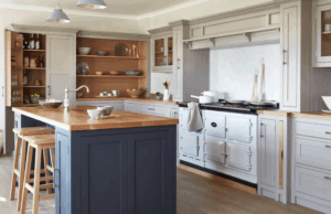 Typowa dla stylu angielskiego jest duża wyspa kuchenna i klasyczny zlew ceramiczny typu Belfast jako centralny punkt.