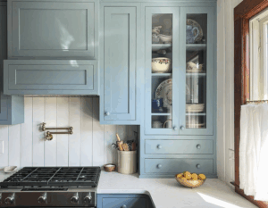 Pastele, rozbielone błękity, beże i odcienie lawendy tworzą jasną, kojącą bazę kuchni w stylu prowansalskim.