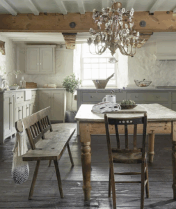 Styl rustykalny nie lubi połyskujących frontów ani neonowego oświetlenia. Wybieraj matowe wykończenia i klasyczne źródła światła.